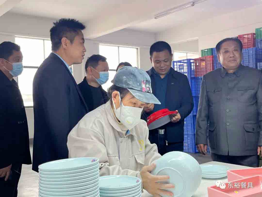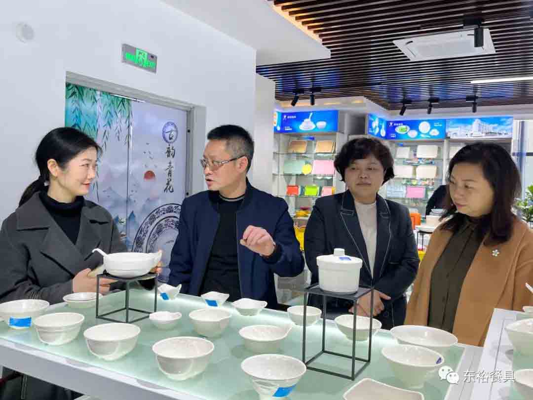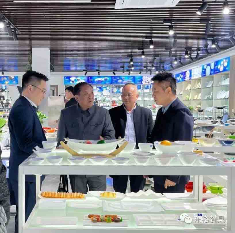 随后谭董带领大家来到东裕科技1栋二楼参观了东裕星空game餐具展厅,展厅面积共500多平米,数十个系列,5000多个器形,数万个产品。东裕科技总经理段平芳向大家介绍了东裕餐具不同器型及风格、介绍了东裕餐具的设计理念,如器型卷边结构、排水豁口、推叠设计、防滑抗摔设计、突显品牌风格设计、餐具阵列搭配设计等等。荷塘区区委常委、区政府常务副区长陈柏文一行领对东裕企业管理及文化建设表示高度赞赏。